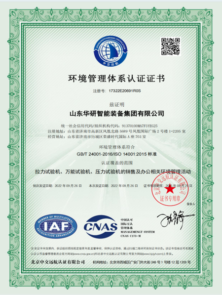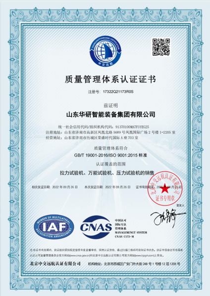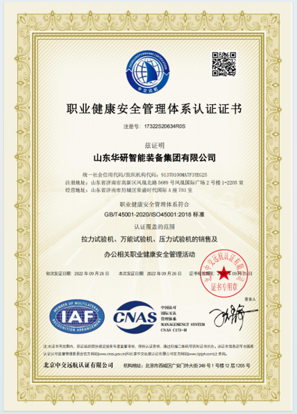 山东华研智能装备集团有限公司是国内专业的试验机制造商,公司坐落于试验机主要研发基地-济南,是集生产、研发、销售为一体的综合性国家级高新技术企业,公司拥有专业研发团队,不断开展新产品研发,公司通过ISO9001质量管理体系认证,IS014001环境管理体系认证,ISO45001职业健康安全管理体系认证,参与制定行业团体标准十余项,拥有国家专利十七项。