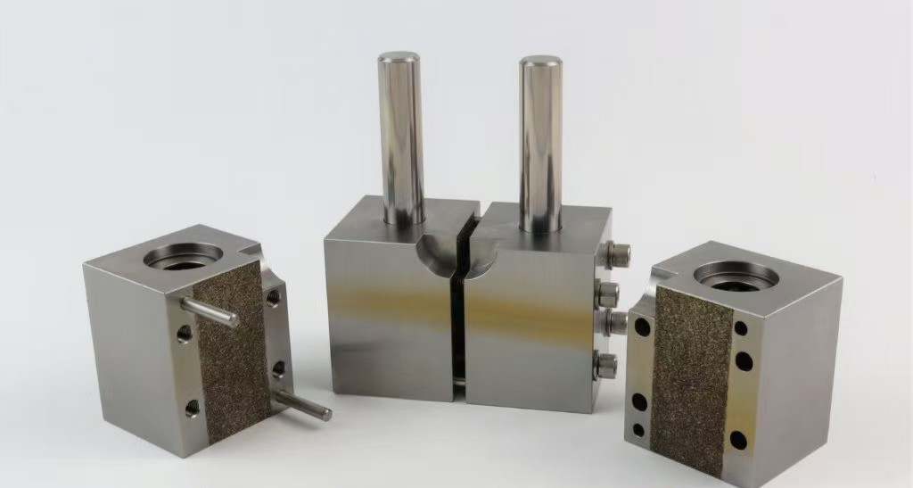 夹具块还可以防止试样的严重弯曲。直线轴承中的两根校准杆用于保持上下两对夹具的对齐,直线轴承消除了校准杆的摩擦力。一面的圆形凹槽为边缘安装的延伸仪提供了间隙,如果使用的话。另外,也可以在试样的一个或两个面上使用粘合应变计。